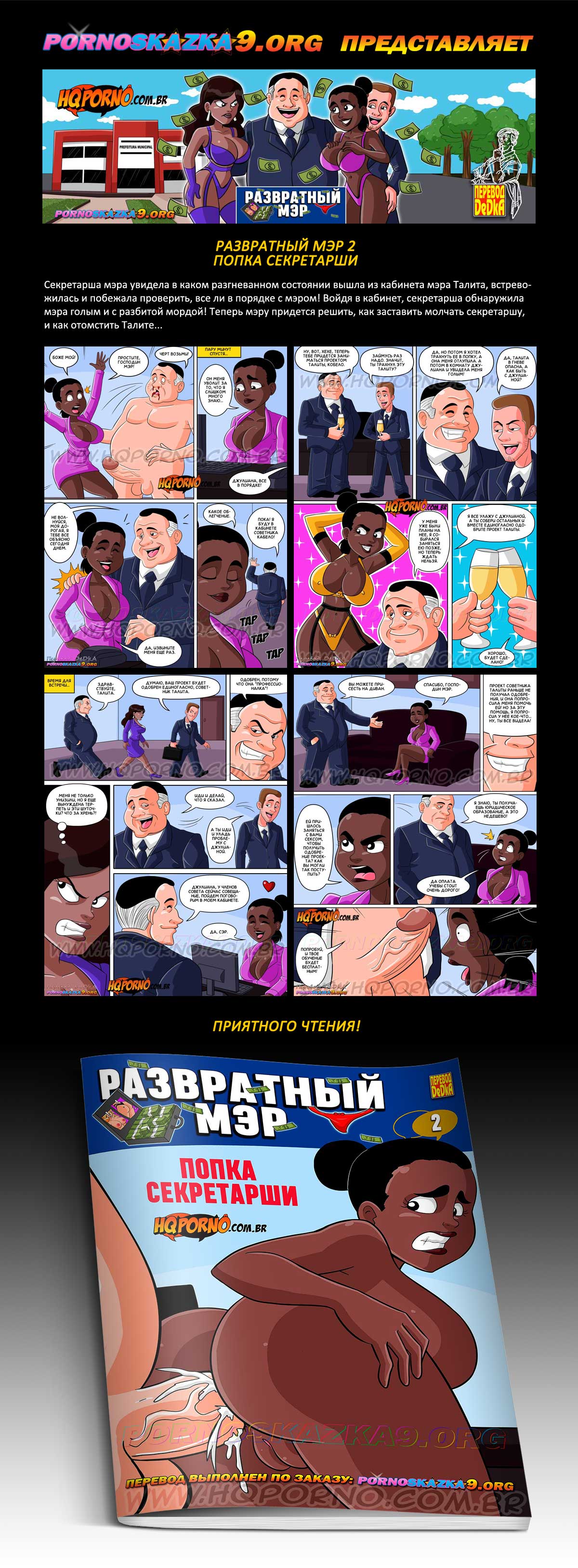 Порно комикс «Развратный мэр. Часть 2. Попка секретарши.» Секретарша мэра увидела в каком разгневанном состоянии вышла из кабинета мэра Талита, встревожилась и побежала проверить, все ли в порядке с мэром! Войдя в кабинет, секретарша обнаружила мэра голым и с разбитой мордой! Теперь мэру придется решить, как заставить молчать секретаршу, и как отомстить Талите…